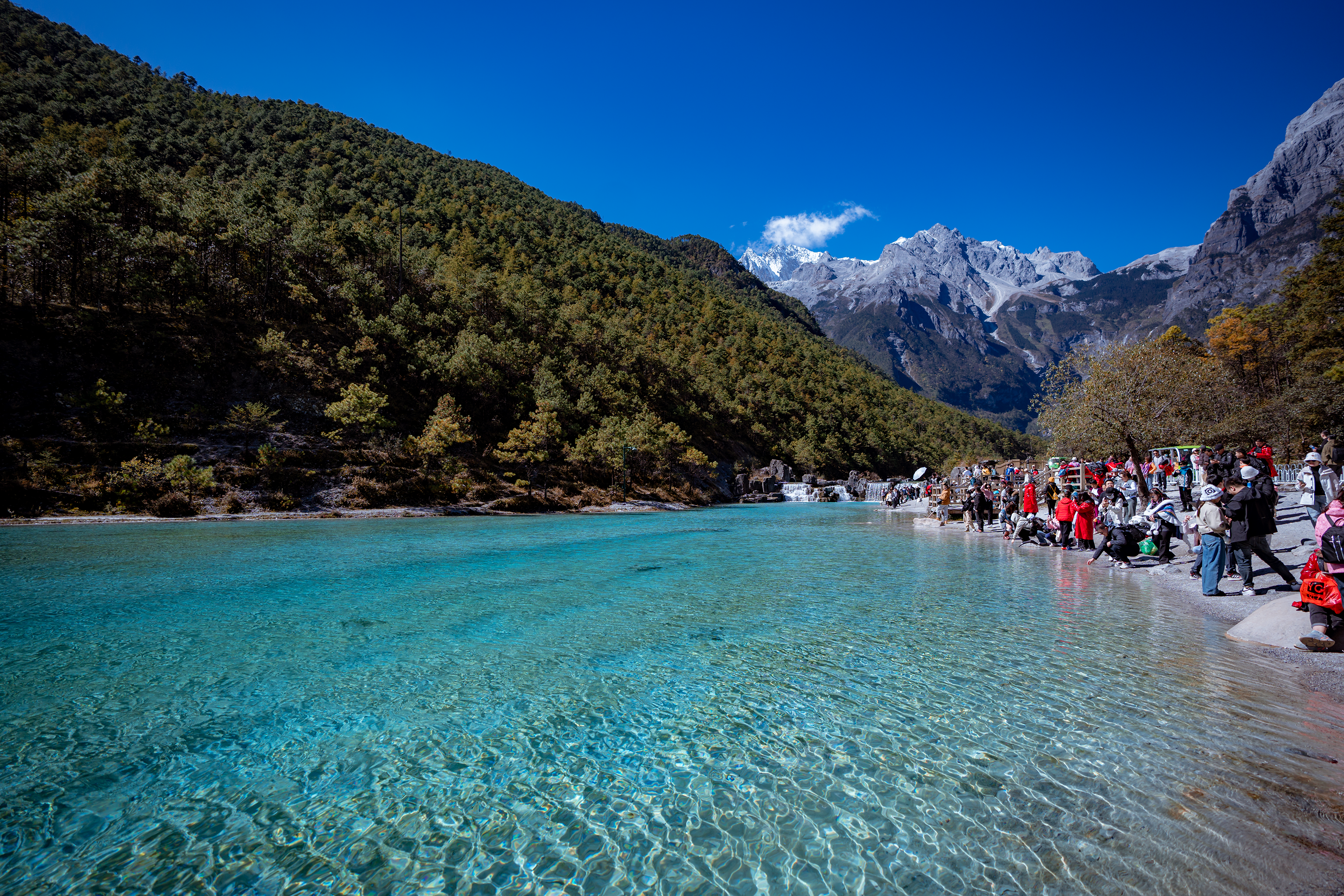 - Sau bữa sáng ngồi xe di chuyển đến ngọn núi được xem là biểu tượng cho sự sống và sức mạnh của người dân Nạp Tây “Núi tuyết Ngọc Long” (bao gồm vé vào cổng, cáp treo nhỏ) sau khi đi qua đồng cỏ Ganhaizi, khí hậu núi tuyết biến hóa thất thường, nhiệt độ trung bình năm chỉ có 5.5 độ C, Ở vùng khí hậu trên cao, bạn có thể cảm nhận được sự yên tĩnh từ xa nhưng trước khi lên núi cần chuẩn bị tốt công tác chống lạnh và chống phản ứng cao nguyên. Ghé thăm dòng sông Bạch Hà nhỏ giọt được hình thành bởi sự tan chảy của băng trên núi tuyết, tham quan “Lam Nguyệt Cốc” (Chỉ bao gồm vé chính vào cảnh điểm, không bao gồm vé xe điện 60 tệ/người) ngắm nhìn dòng nước xanh biếc uốn khúc như hình lưỡi liềm dưới ánh nắng như một vầng trăng khuyết màu xanh.